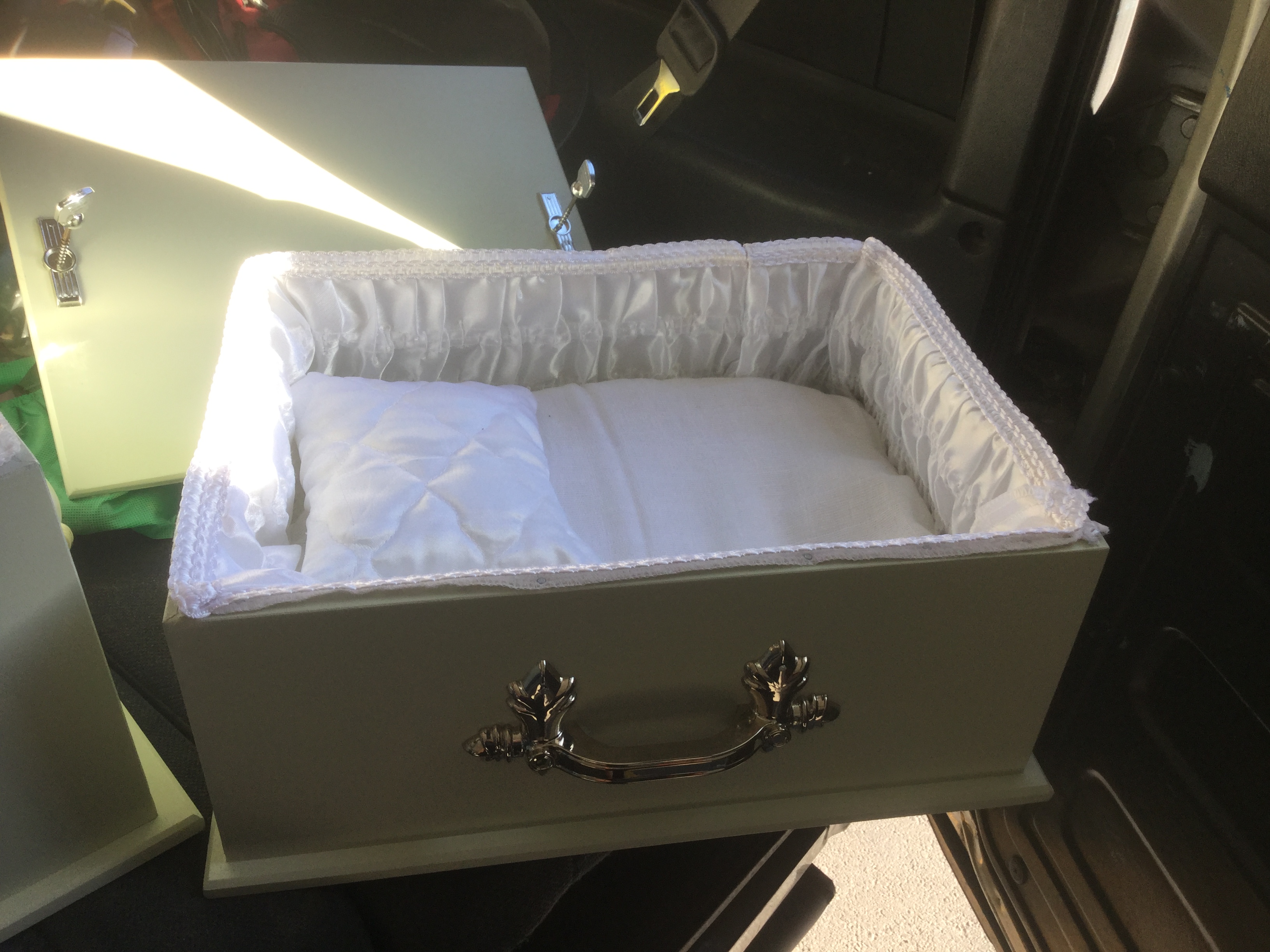 Jill looks after the preparation , painting and decorating of the Angel boxes and Urns . These are delivered to the Christchurch Women’s Hospital as required .Four sizes are regularly available. We can also provide caskets for cot deaths free of charge. She can be contacted on mobile 0212602577